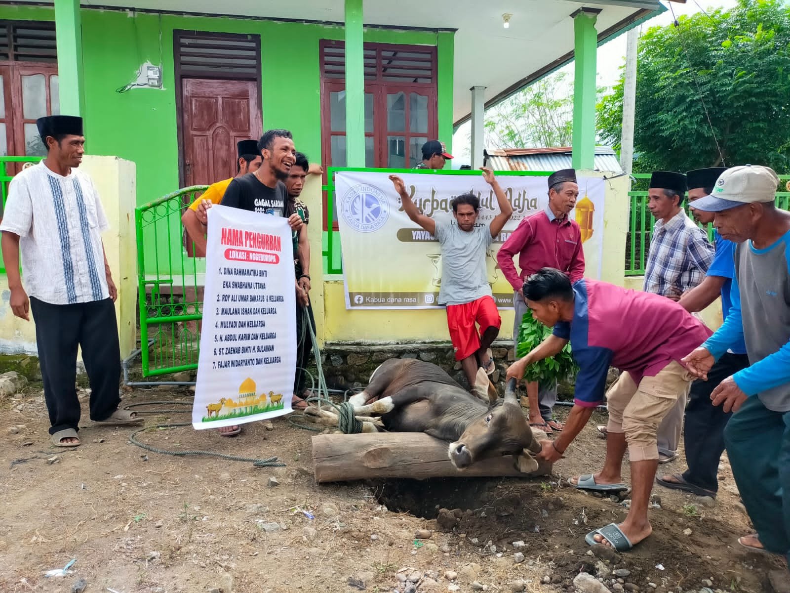 Pemotongan hewan dimulai pada pukul 10.13 WITA dengan melibatkan pemuka adat dan masyarakat sekitar juga perwakilan dari yayasan kabua dana rasa yaitu Maulana Ishak dan Sri Wahyuningsih. Kemudian dilanjutkan dengan Pembagian daging kurban pada pukul 13.00 WITA (bada shalat dzuhur) yang dilakukan oleh perwakilan dari yayasan kabua dana rasa dan penanggung jawab qurban di dusun Nggerukopa yaitu pak Adi. Masyarakat merasa sangat bersyukur dan berbahagia dengan adanya kegiatan ini karena mereka bisa merasakan banyak hikmah dan keberkahan berkurban.